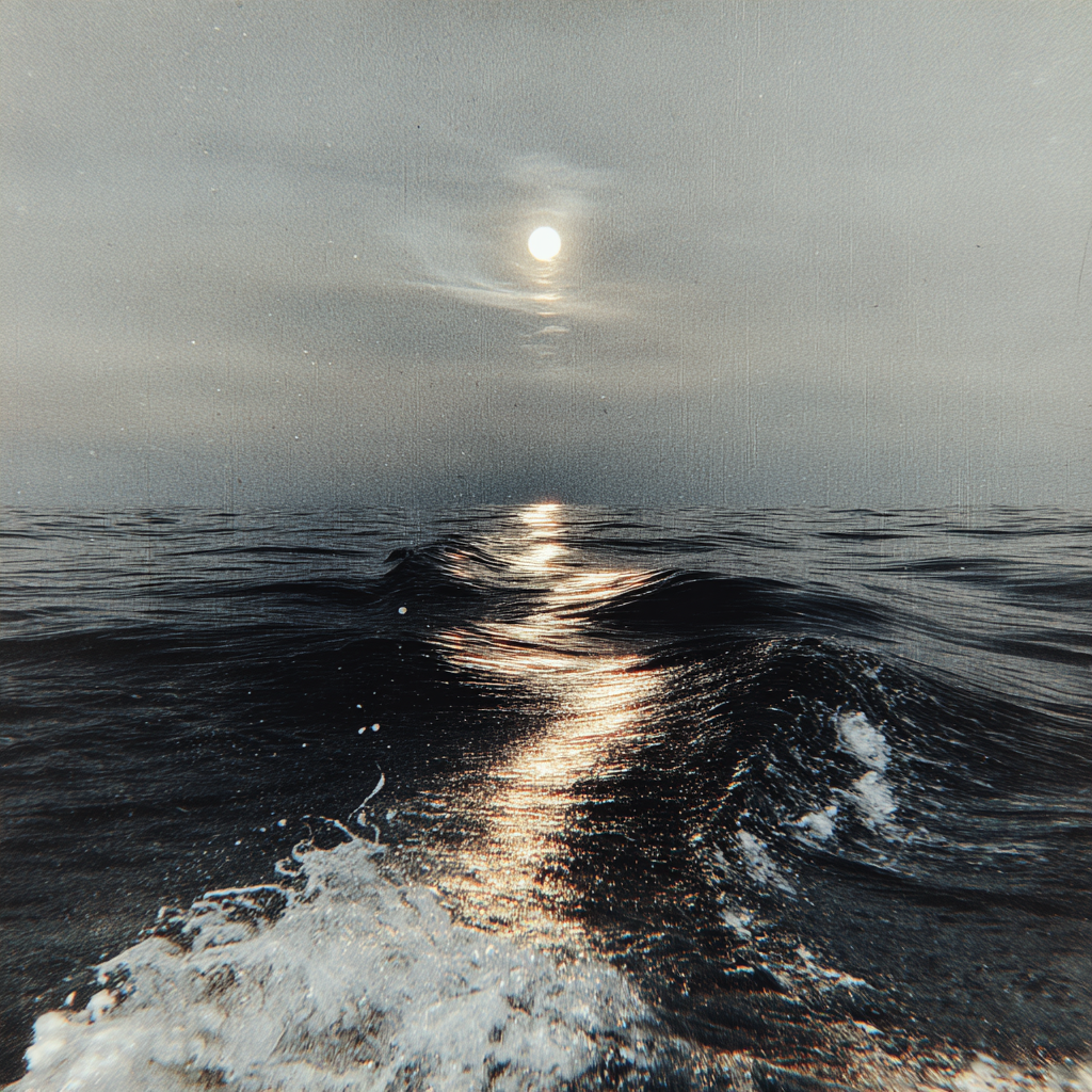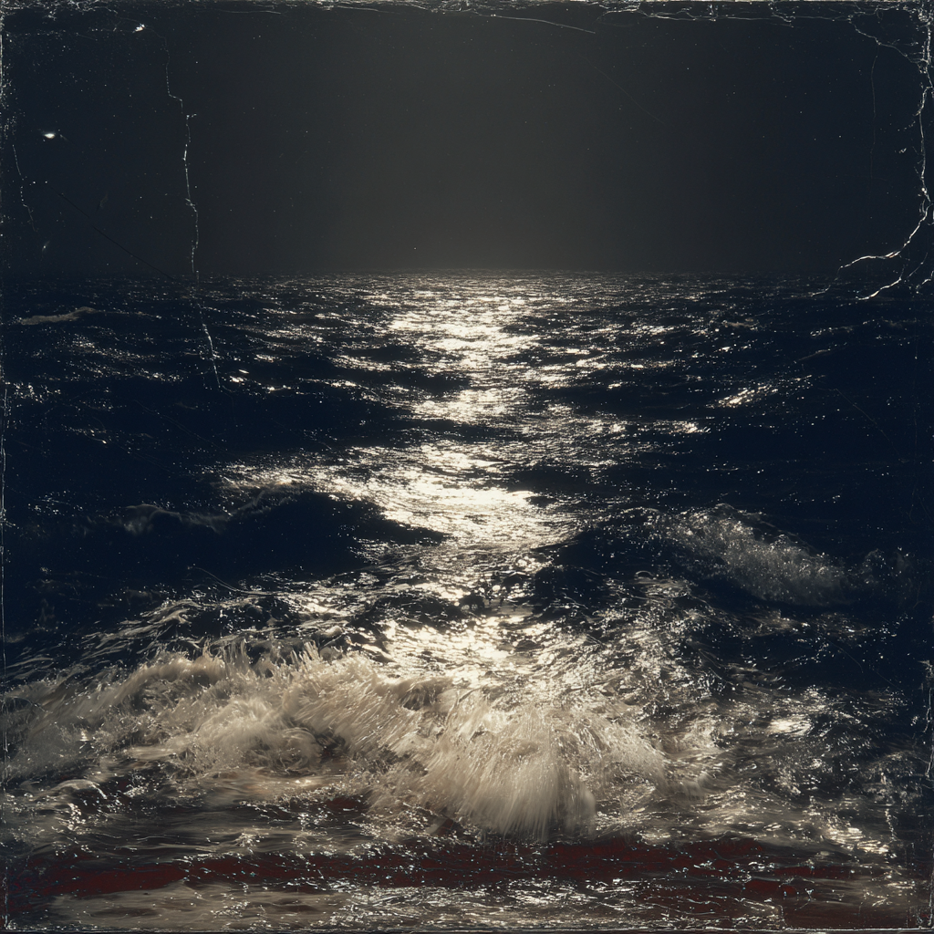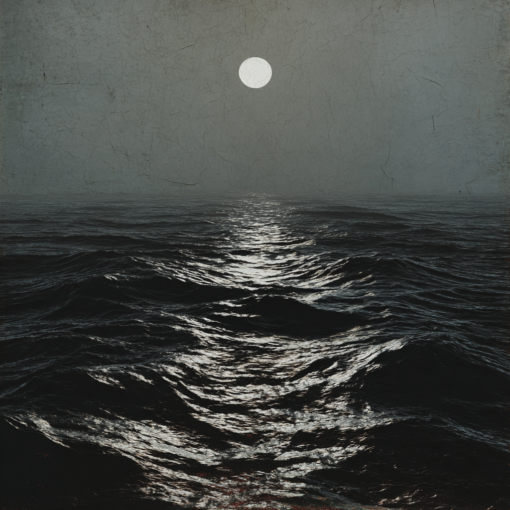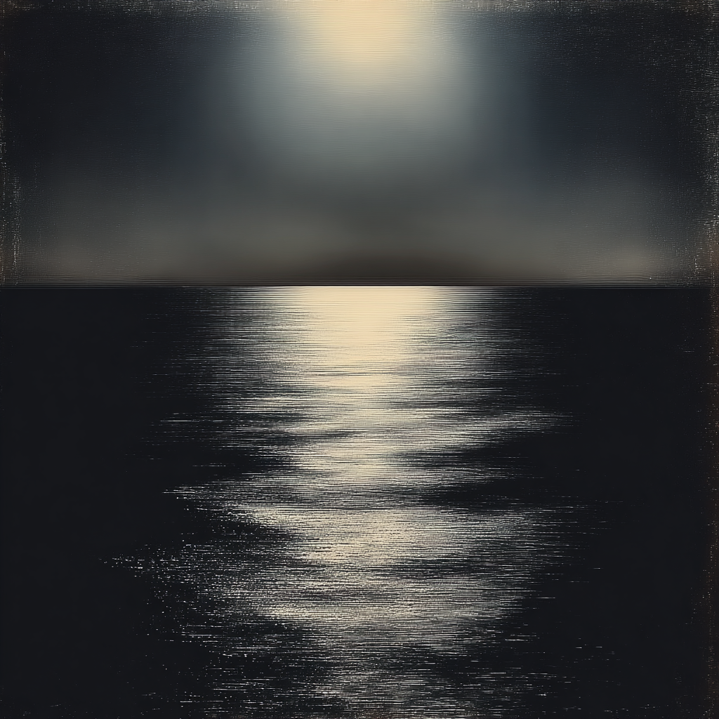 The sea moves slowly under a distant light.