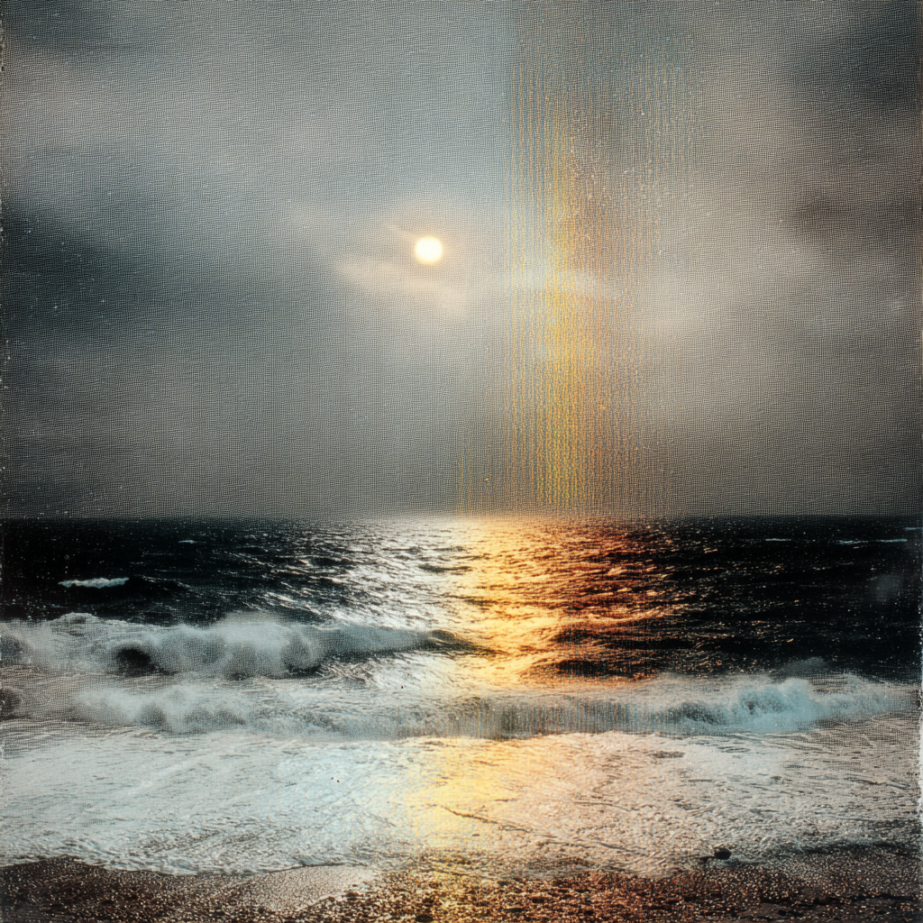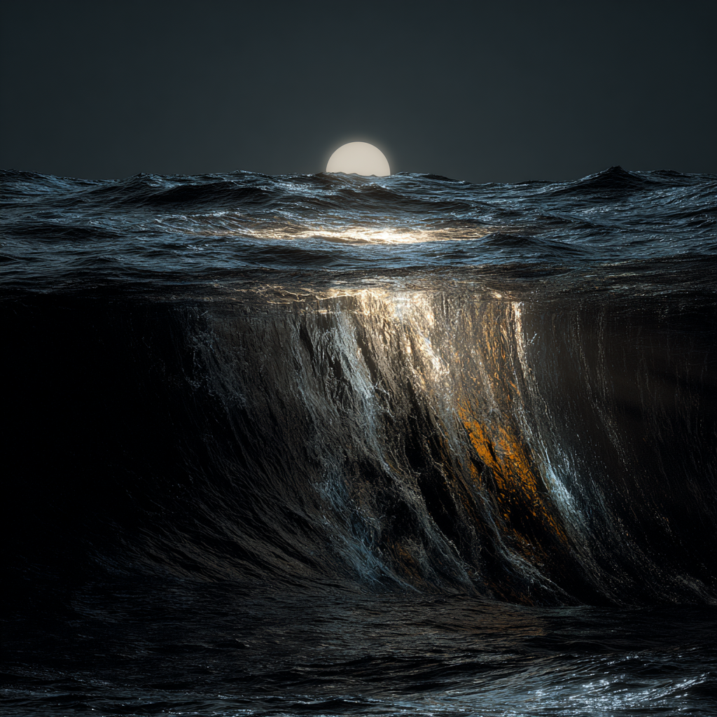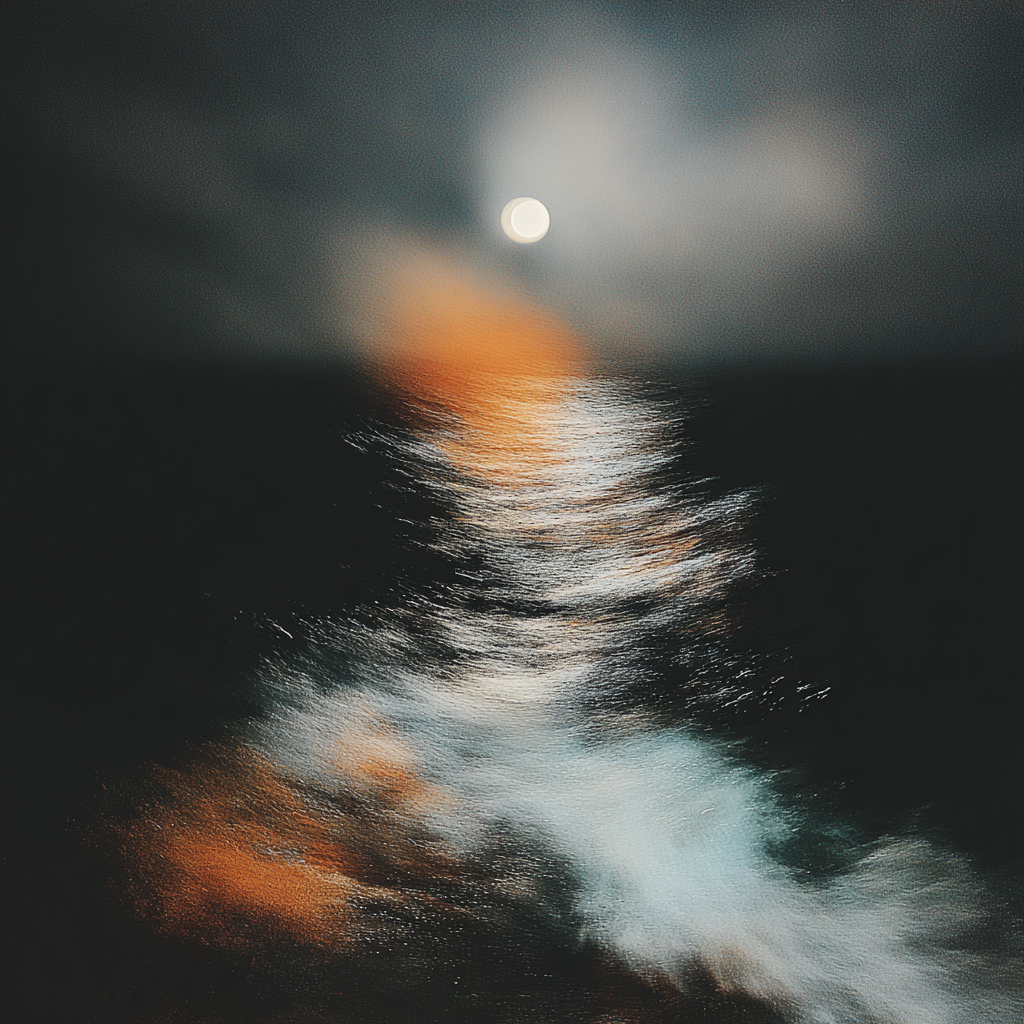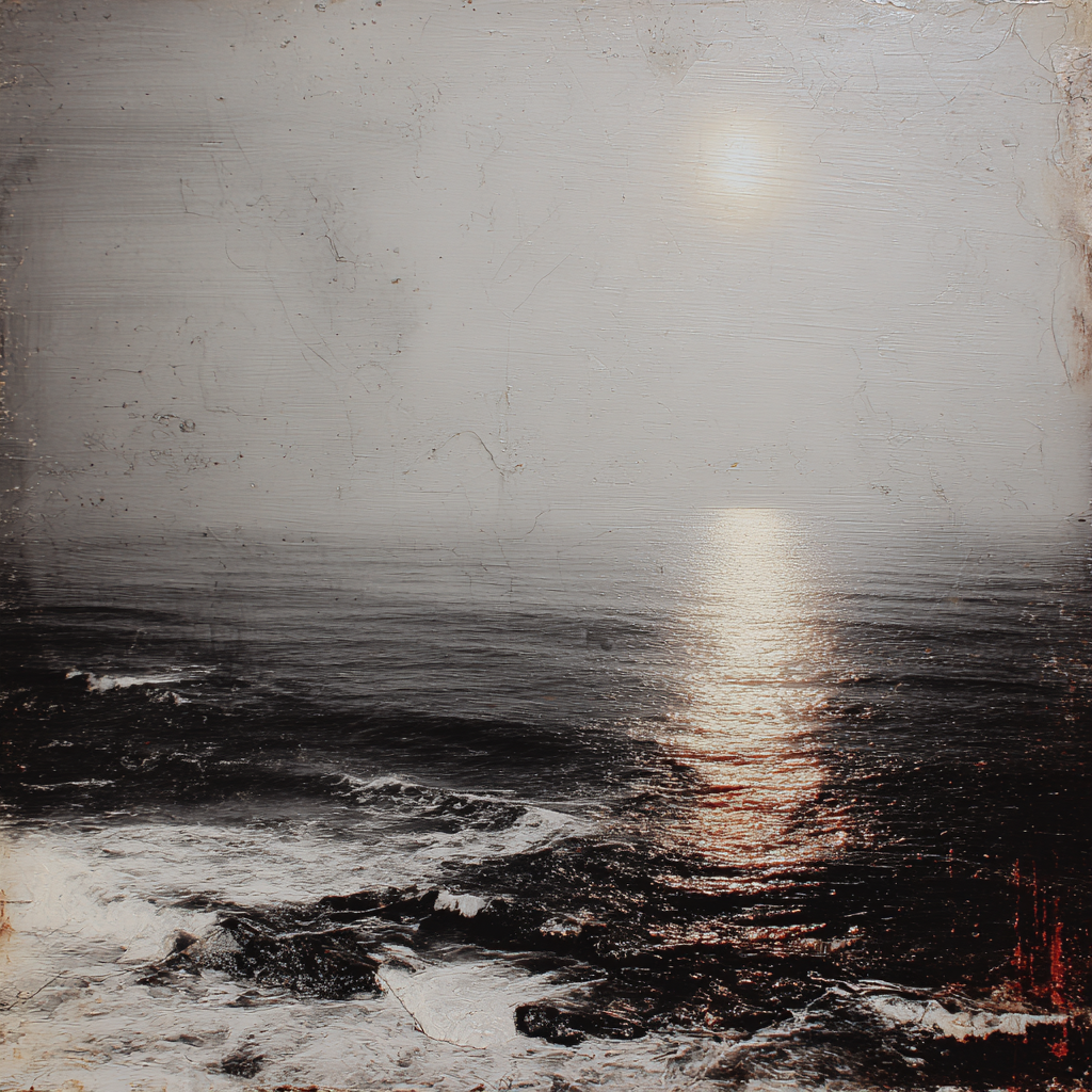 The sea moves slowly under a distant light.